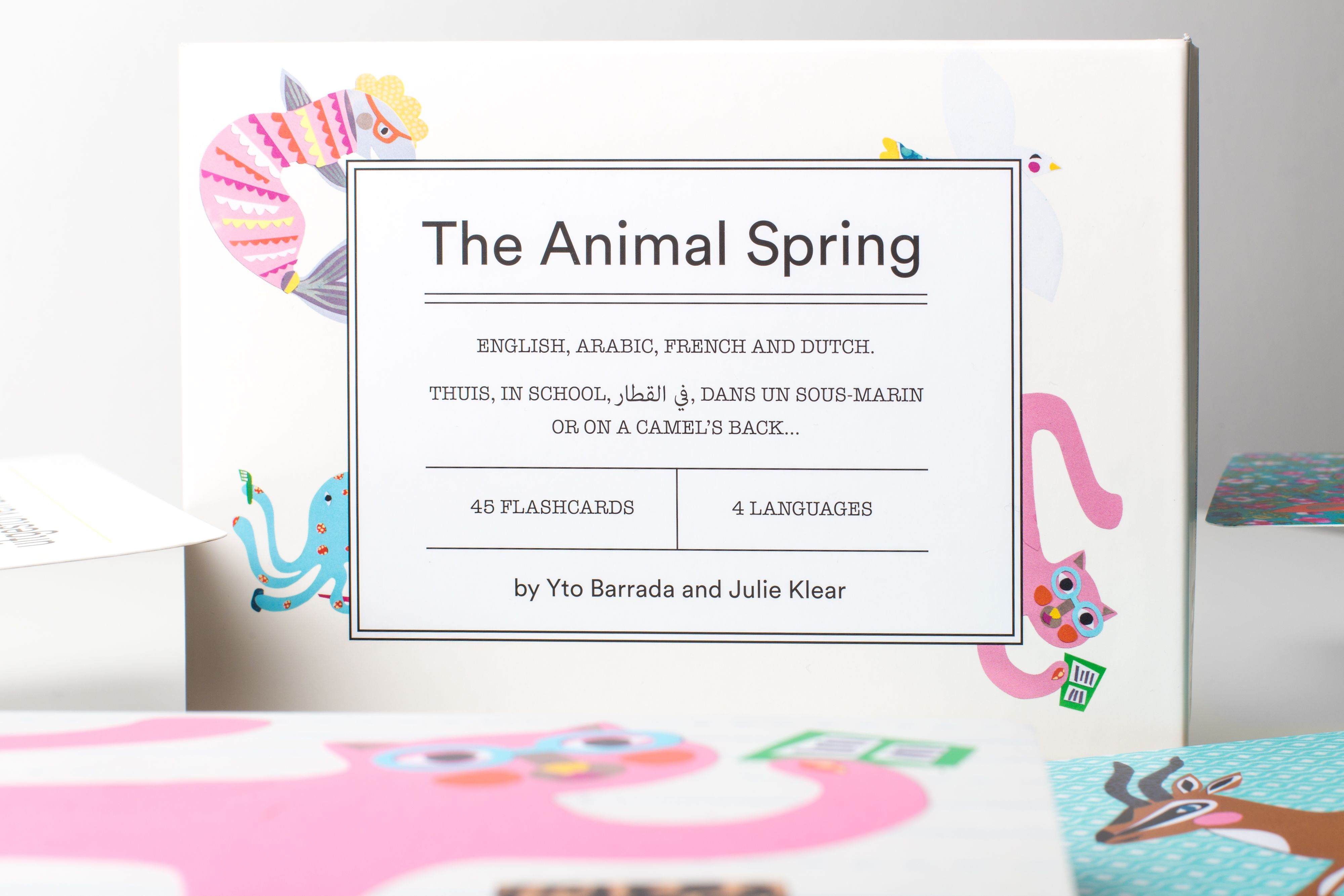 Yto Barrada, in collaboration with designer Julie Klear and supported by Nask Studio for graphic design, created The Animal Spring, a card game inspired by Brussels’ multilingual and multicultural environment. The game consists of 40 cards featuring animal names and adjectives in Arabic, French, Dutch, and English. Players can combine these cards to form alliterations, poems, humorous phrases, and wordplays, encouraging children to explore languages and words in a playful manner.